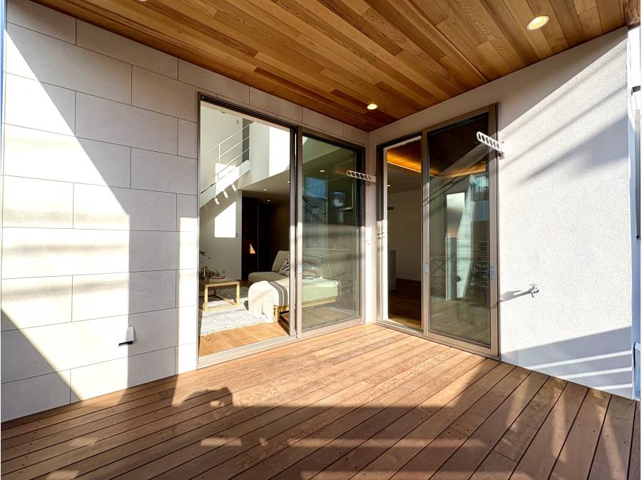 外観もモダンなタイル貼りと天然木の軒天を組み合わせ、デザイン性と耐久性を両立させました。