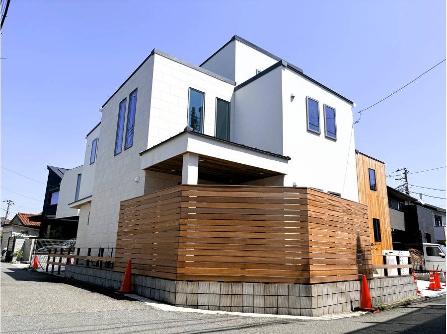 青空に映える白い外観と、温かみのある木目調のフェンスが目を惹くモダンな邸宅。