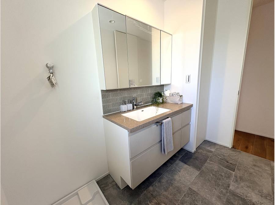キッチンはご家族の顔を見渡せるオープンな対面スタイルを採用し、お料理中も会話が弾む設計です。洗面室やバスルームなどの水回りも、ホテルライクで洗練されたデザインに統一し、毎日の身支度やバスタイムをワンランク上のリラックスタイムへと導きます。