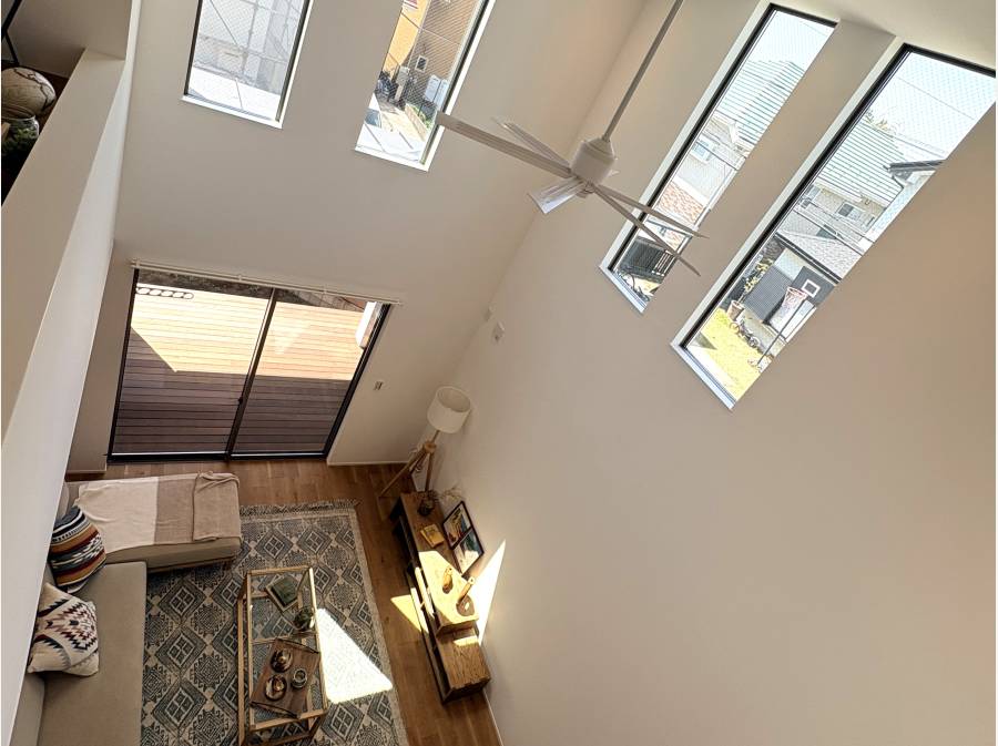 高窓からたっぷりと自然光が降り注ぎ、シーリングファンが部屋全体に心地よい空気を循環させます。