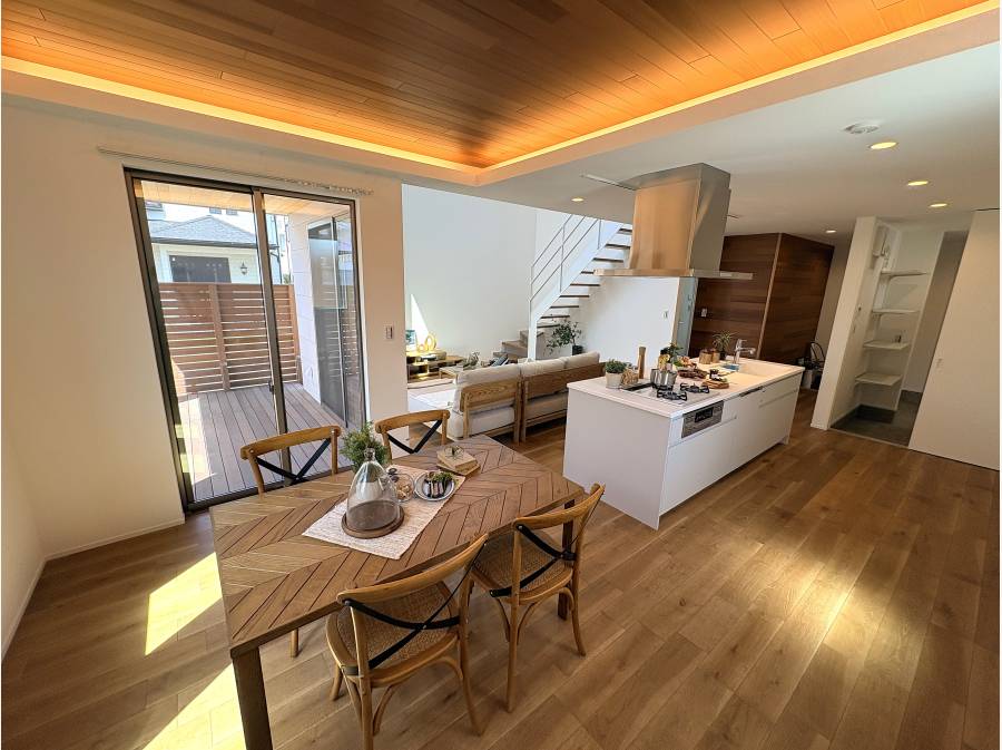 また、リビングからつながるウッドデッキは、高い木製フェンスによって外からの視線をしっかり遮ったプライベート空間。天気の良い休日のブランチや、ご家族のくつろぎの場として大活躍します。