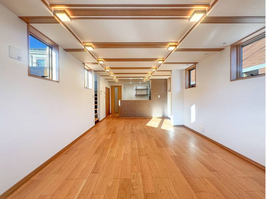 ゆとりある玄関を抜けると、天井に並んだ照明が奥行きを感じさせる素敵なLDKが広がります。