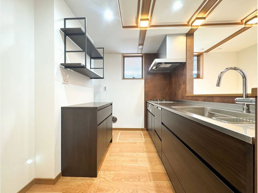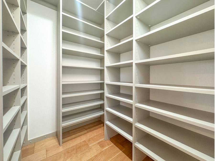 キッチン周りにはパントリーや収納棚が備わり使い勝手が良さそう。
