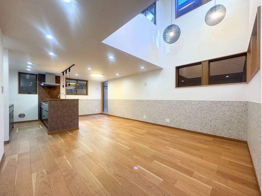 リビングへ足を踏み入れ見上げる先に広がるのは、光降り注ぐ開放的な吹抜け空間。