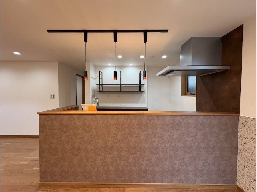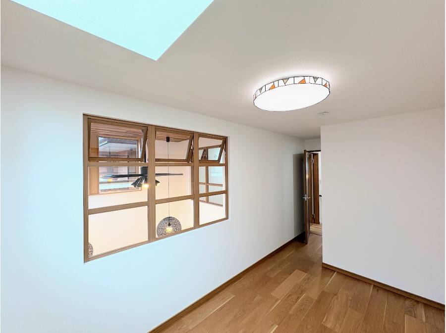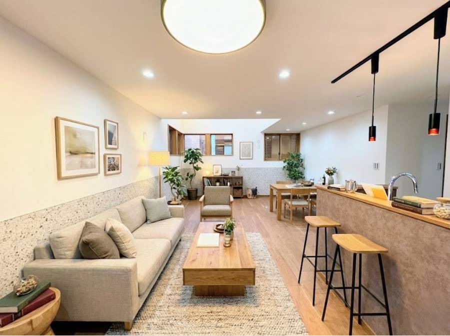 玄関を開けると広がるのは、オーナー様のこだわりが随所に光る空間です。キッチンから続くLDKは、光と風が心地よく通り抜ける開放的な設計。洋室のシーリングファンがゆっくりと回る様子は、リゾート地のようなリラックス感を演出します。
