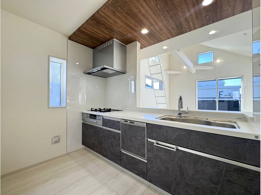 ウッド調のポップアップ天井がリズミカルなキッチンには食洗機を完備。