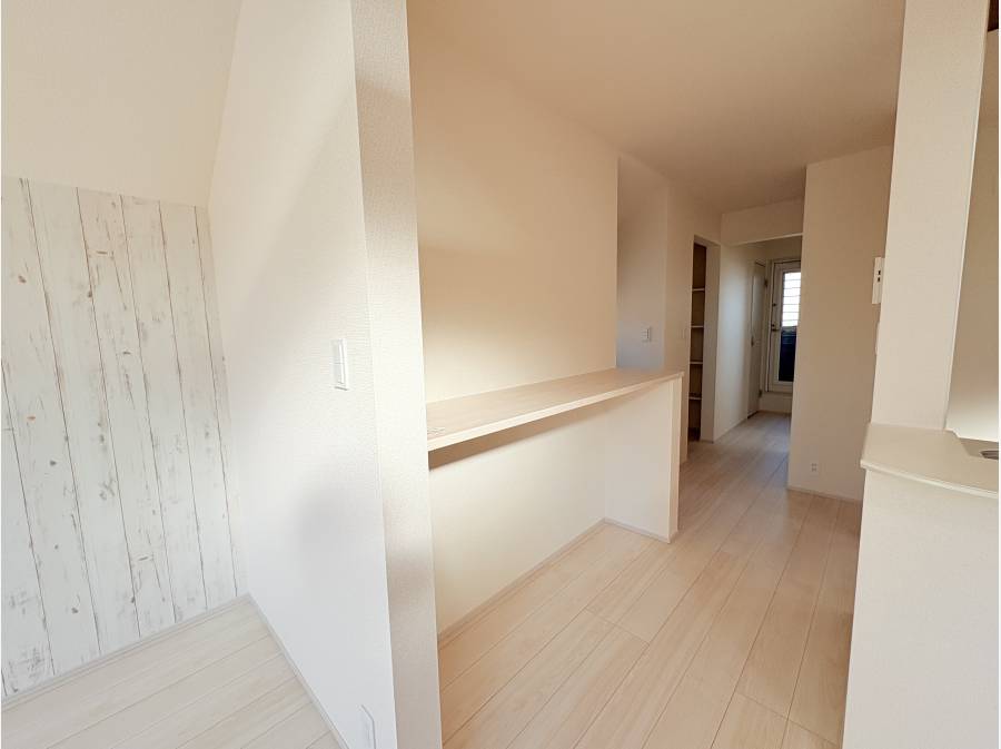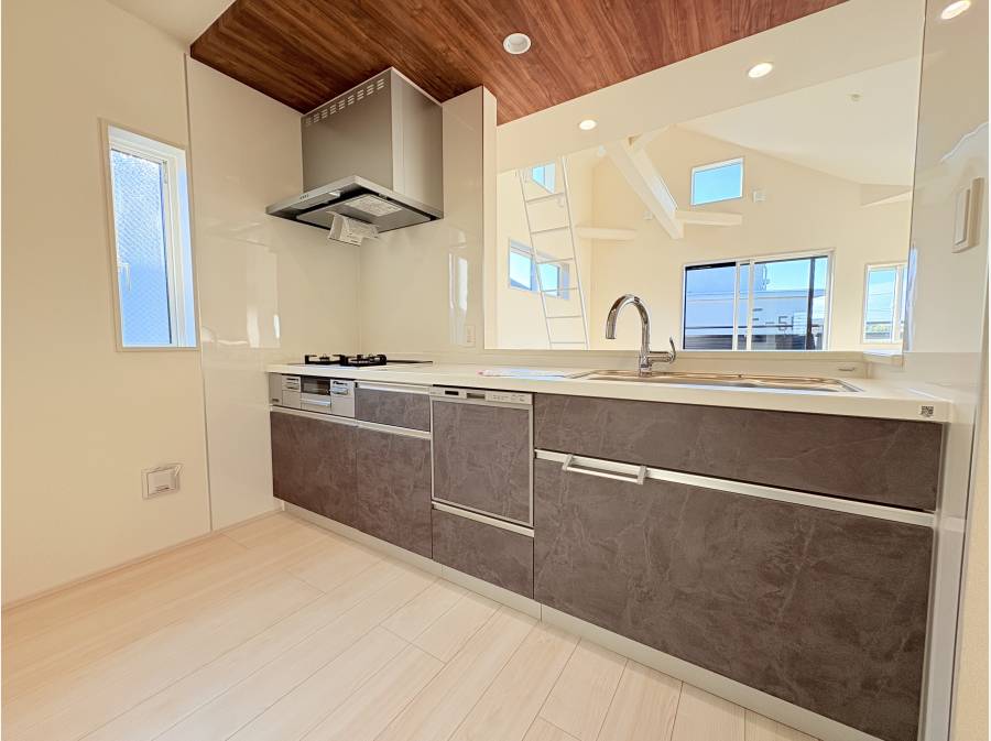 キッチンにはフルフラットカウンターを採用し、開放的な空間を実現。食洗機や浄水器も備え、お手入れも簡単です。