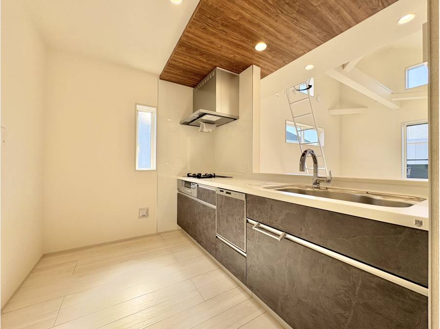 キッチンには可動棚付きのパントリーがあり、日用品や調味料をすっきり収納できるため、キッチン周りが片付きやすくなっています。