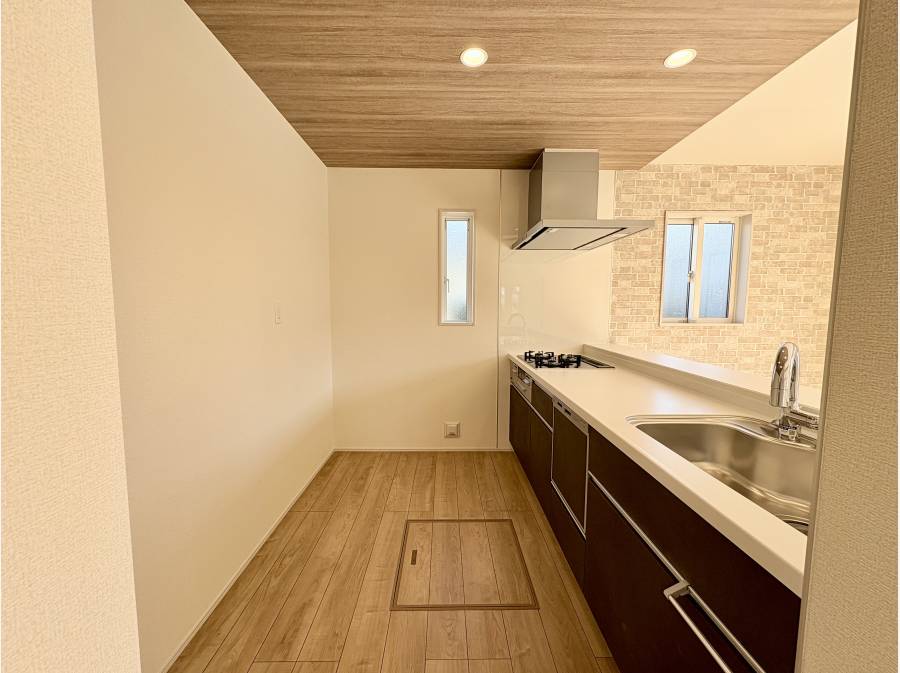 対面式のシステムキッチン。キッチンスペースは広々空間。料理もストレスフリーで調理できます。