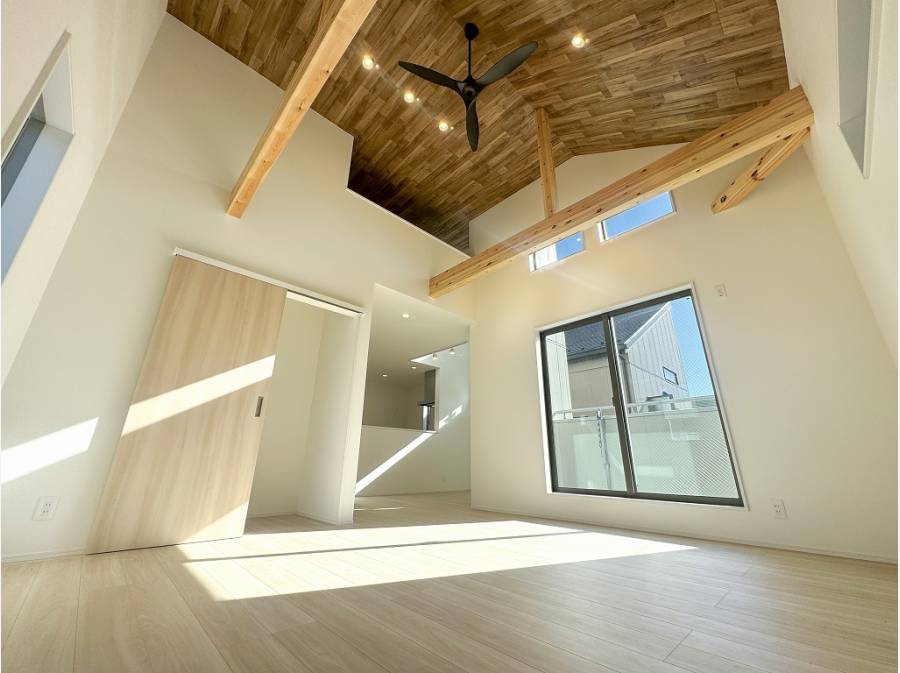 LDKの一部は勾配天井になっており、高窓から燦燦と陽の射し込む明るい空間。