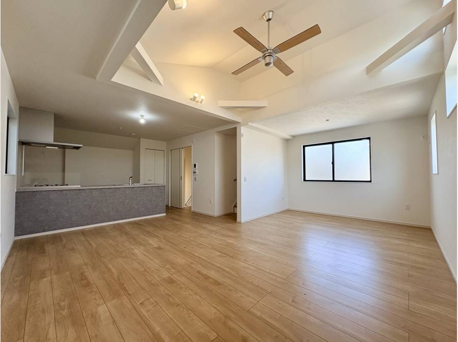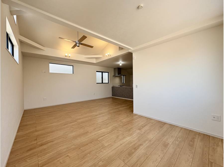 LDKは20帖を超える広さで、吹き抜けの高い天井にはシーリングファンを設置。