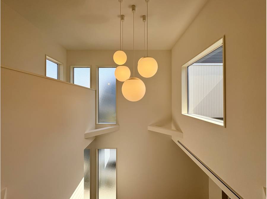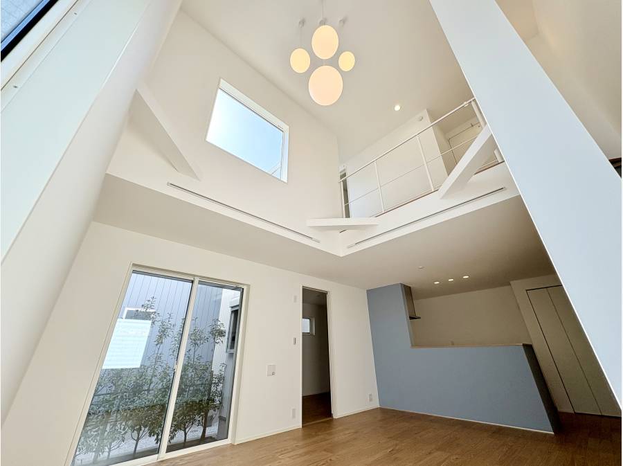 吹き抜けのリビングは大きな窓からたっぷりと光が差し込み、ゆったりとくつろげる空間です。さらに天井の照明もお洒落なデザインとなっています。