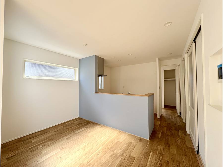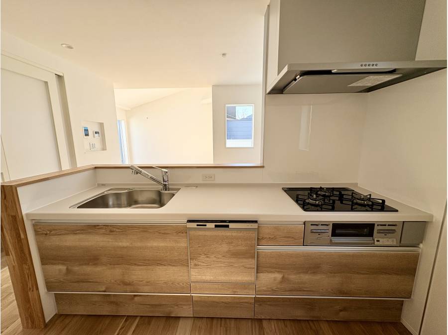 17.9帖のLDKは吹き抜け仕様で広がりを感じる空間。対面式システムキッチンや食洗機付きで、日々の家事もスムーズです。