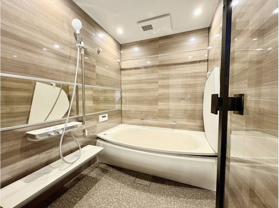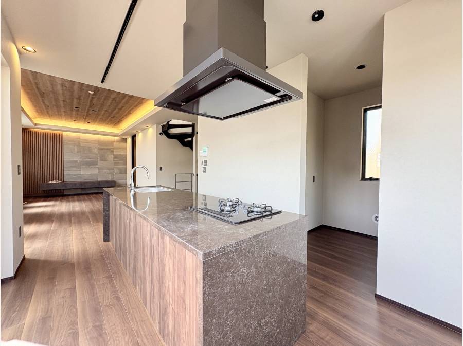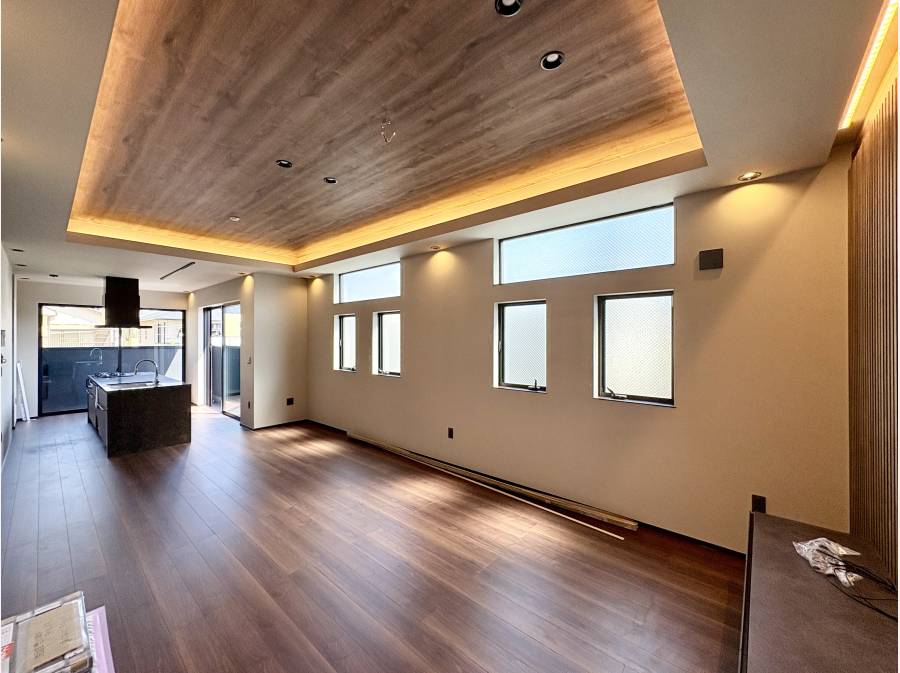 21帖の広々としたLDKには、必要な分だけ光を取り込む設計が施され、上部には間接照明が配されており、落ち着いた雰囲気の中でくつろげる空間が広がります。