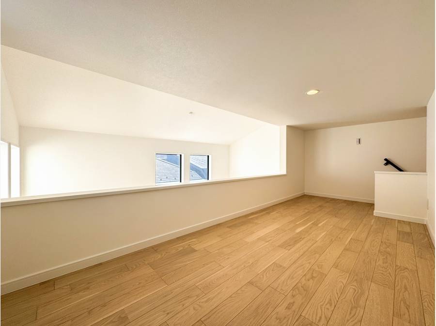 見上げた先に広がるワイドなロフトは、アウトドア用品や嵩張る日用品を収納してもまだまだ余裕がありそう。
