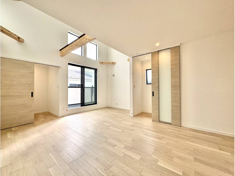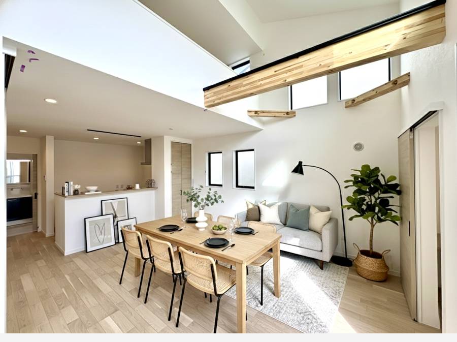 2階のLDKは吹き抜けがもたらす開放感があり、隣接する書斎スペースはテレワークや趣味の時間に最適です。