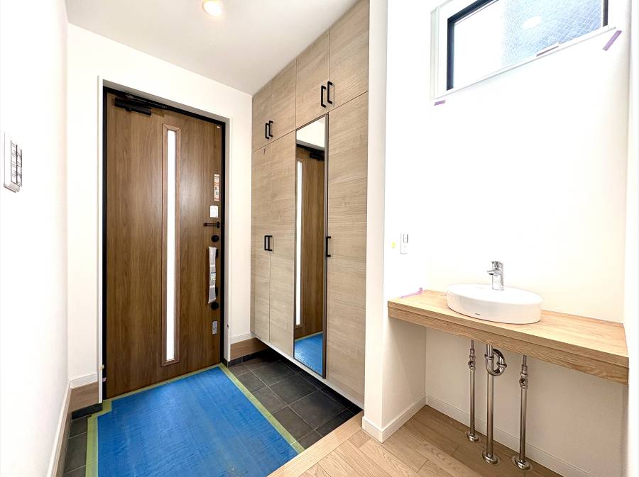 玄関ホールには帰宅してすぐに手を洗えるセカンド洗面を設置するなど、現代の暮らしに寄り添った工夫が随所に見られます。