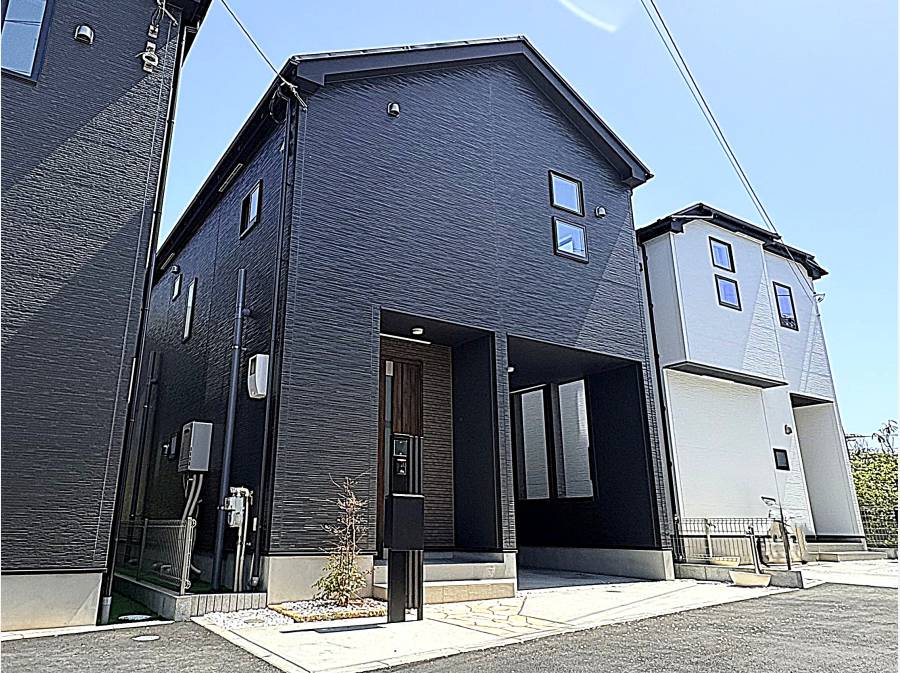 愛車を守るビルトインガレージ付きの邸宅。黒のモダンな外観が印象的で、木目調の天井が魅力的な広々としたLDKや、収納力のある明るい洋室がご家族のゆとりある暮らしを実現します。