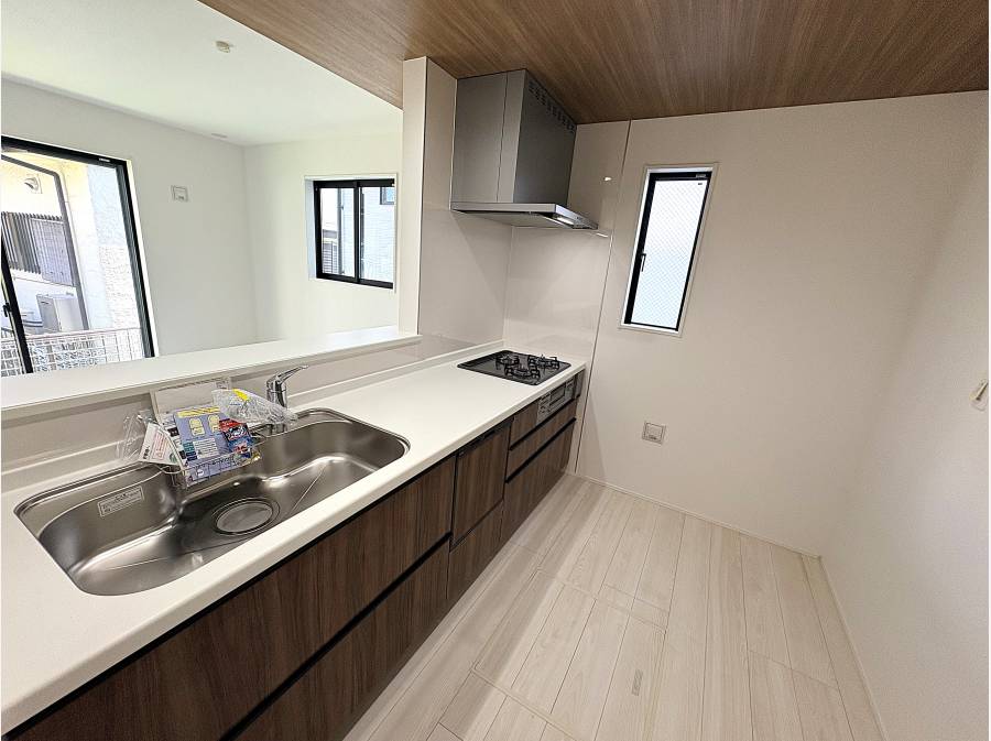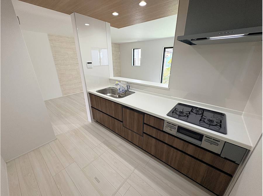キッチンには、対面式のシステムキッチンを採用。シックな木目調パネルが高級感を醸し出しています。リビング全体を見渡せる配置のため、料理をしながら家族との会話を楽しめ、小さなお子様がいるご家庭でも安心。3口コンロと広いワークトップを備え、日々の料理や片付けも快適に行えます。