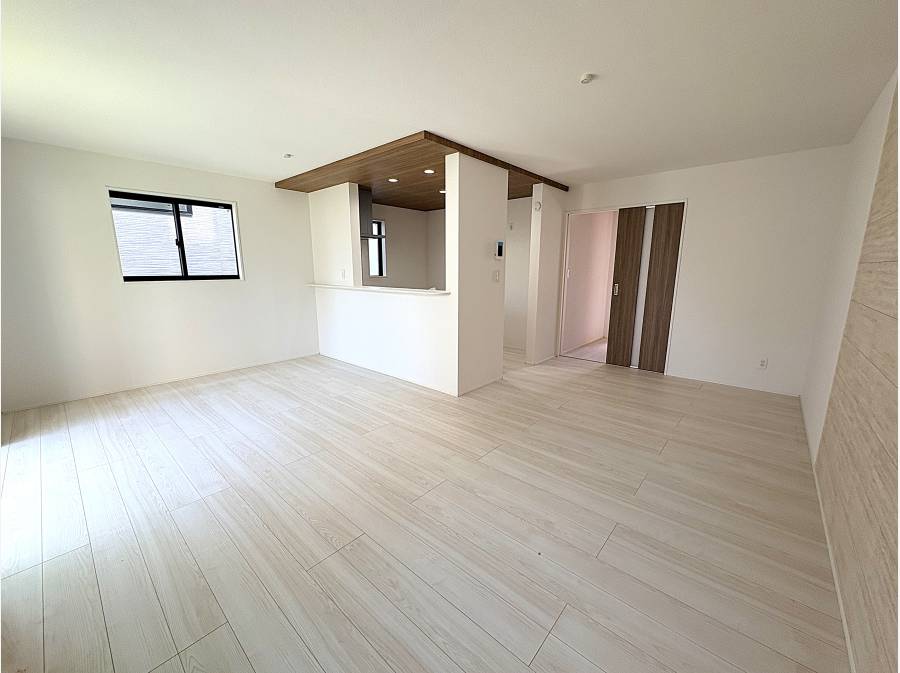 ご家族が集うLDKは、白を基調とした明るく開放的な空間。木目調の下がり天井やアクセントクロスを採用し、カフェのようなおしゃれで落ち着いた雰囲気を演出しています。複数の窓から自然光が入り込み、のびやかで快適なリビングを実現しました。