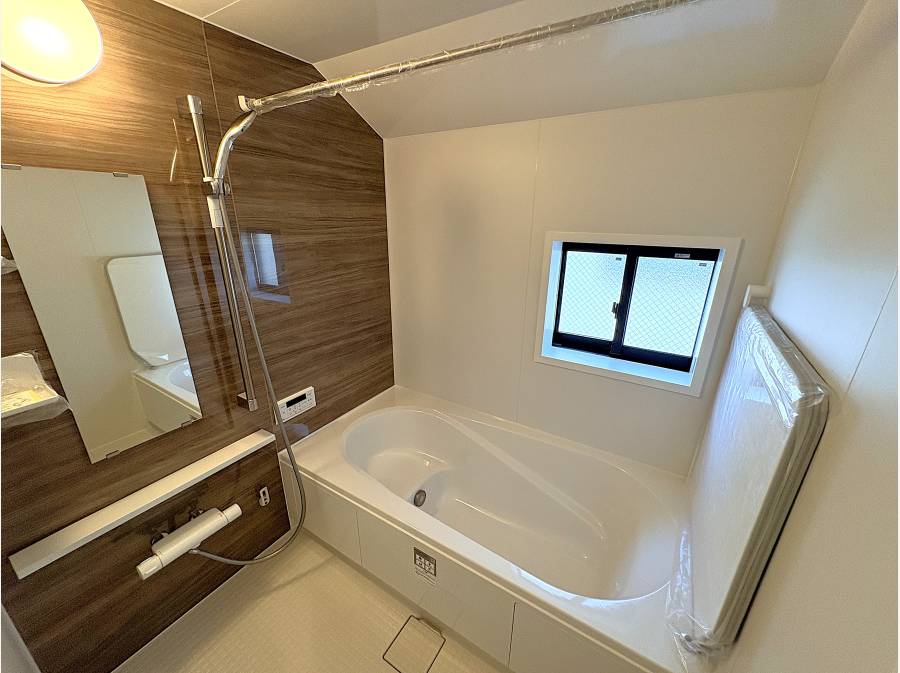 バスルームは木目調のアクセントパネルを採用し、落ち着いた雰囲気で癒しの空間を演出。窓付きで自然光を取り入れることができるだけでなく、湿気を逃がしやすく、換気もしやすい設計になっています。清潔でリラックスできるバスタイムをお楽しみいただけます。
