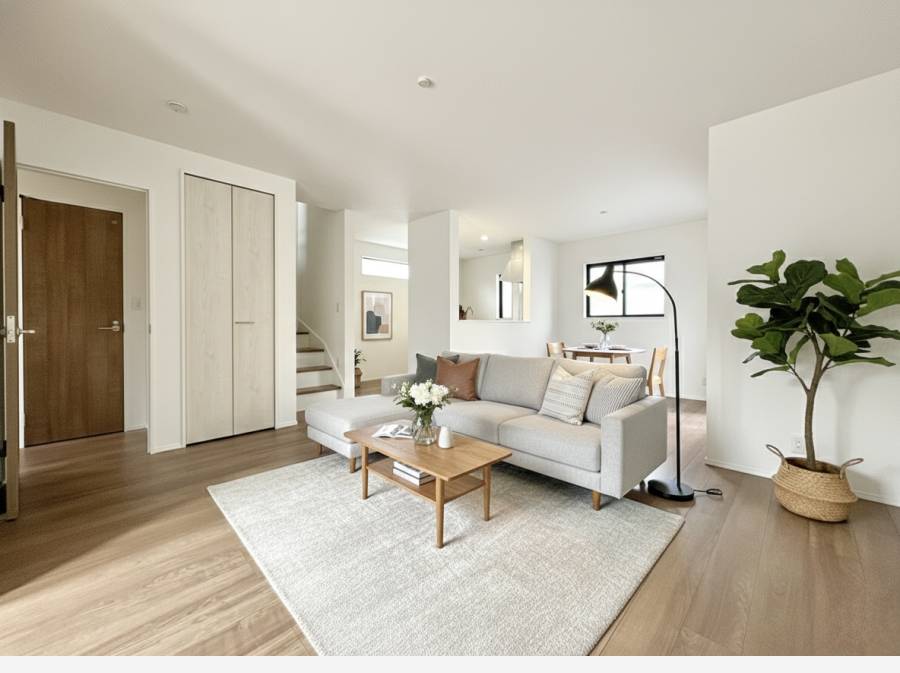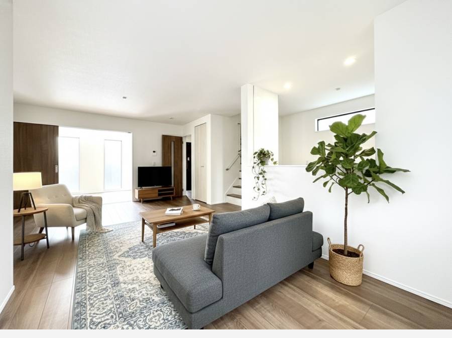 1階には広々とした明るいLDKが広がり、3面採光の陽光が心地よく差し込みます。
