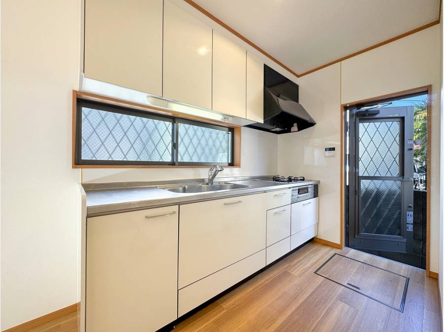 キッチンには何かと便利な勝手口が隣接。外へとダイレクトに繋がる動線が、毎日の家事ルーティンを軽やかにサポートしてくれます。