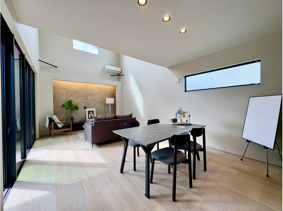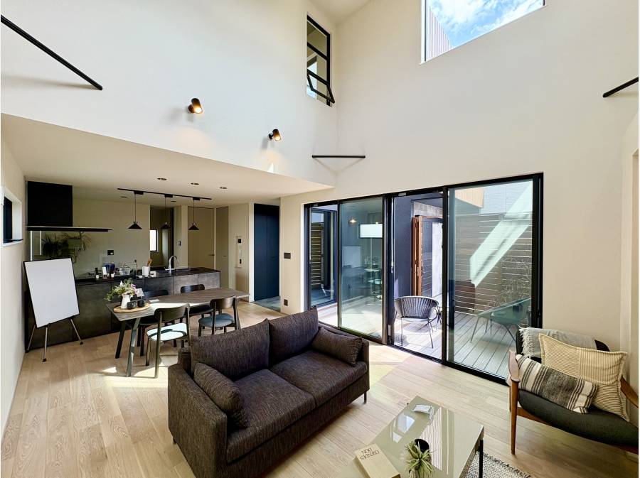約21.0帖の広々としたLDKは、天井高が5mを超える吹抜けが特徴で、日常に特別な感覚をプラスします。3面に配置されたFIX窓からは、時間とともに変化する自然光がたっぷりと差し込みます。