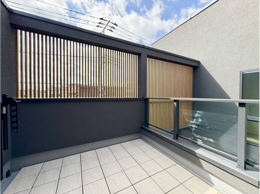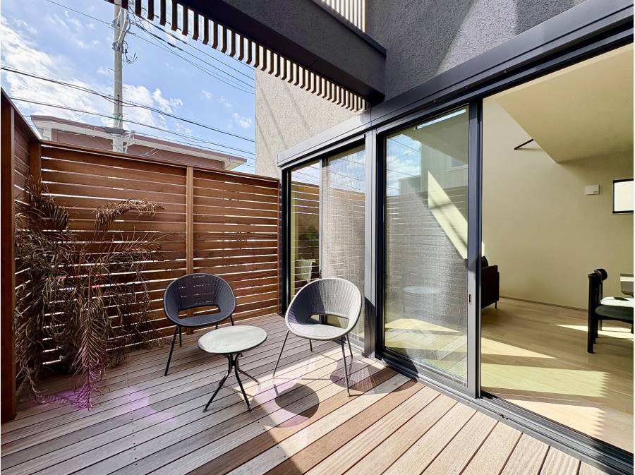 外部吹抜を利用したプライベートデッキでは、周囲の目を気にせずリラックスした時間を楽しむことができます。