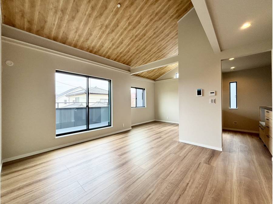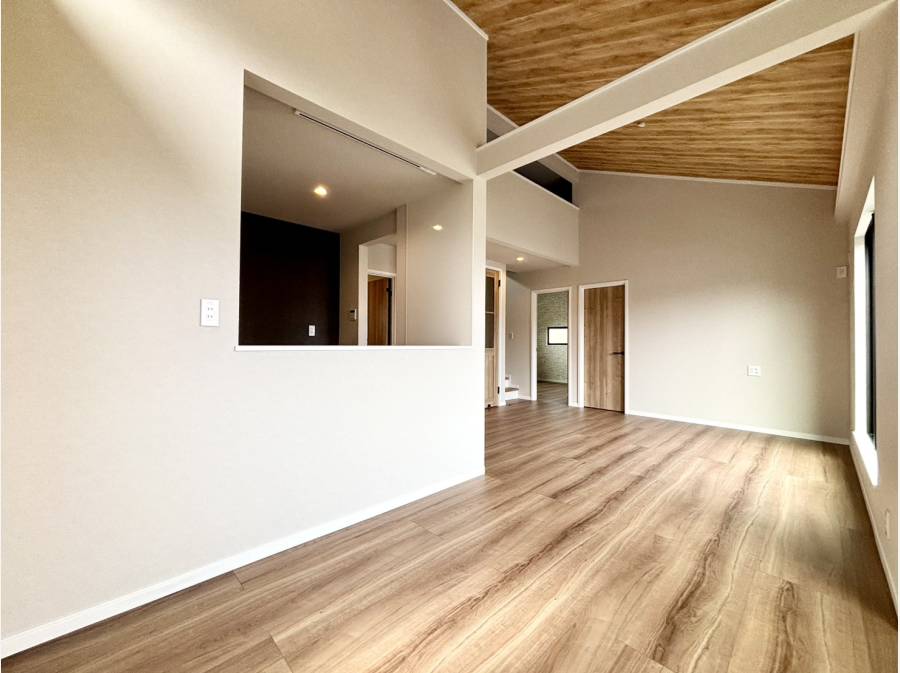 室内は、2階リビングに勾配天井を採用し、明るく広がりのある空間を実現。加えて、固定階段でアクセス可能な約17帖のロフトは、フラットな天井が使いやすく、まるで「秘密基地」のような楽しさを提供します。