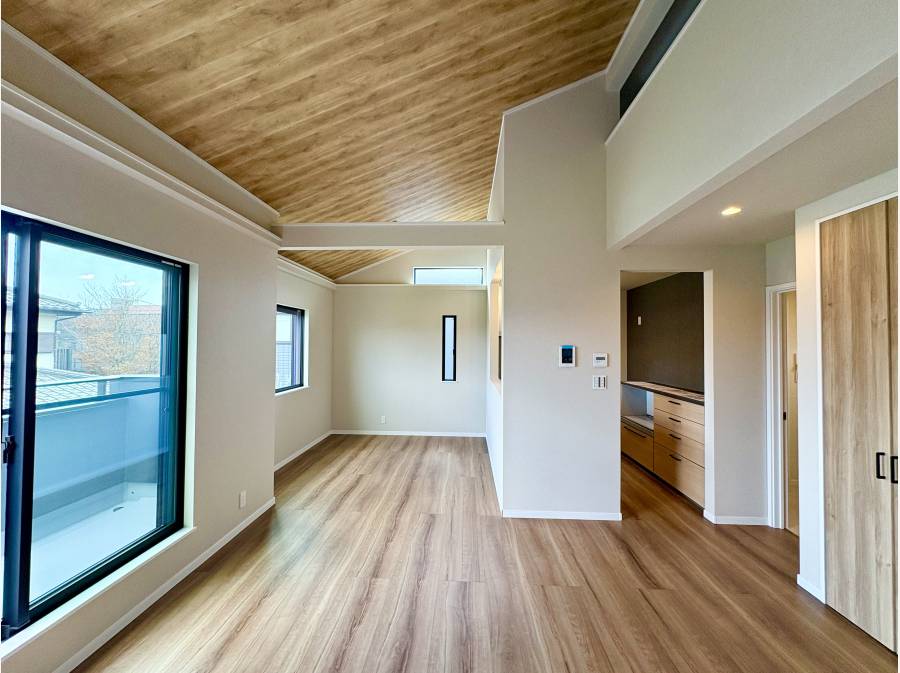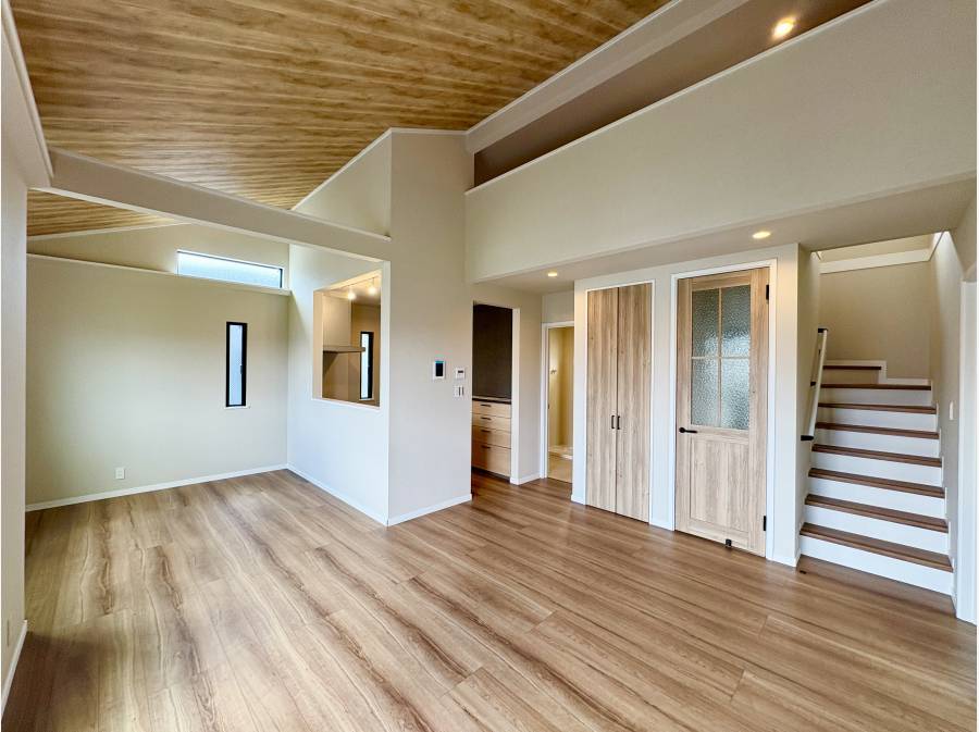居住空間も充実しており、2階のリビングダイニングは開放的な勾配天井に床暖房を完備し、さらに階段で上がれる17帖もの広大なロフトが趣味や収納の幅を広げます。