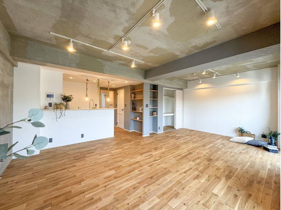 約22帖の開放感溢れるLDKは、インダストリアルな雰囲気を纏う塗り壁に天然無垢を使用した温もりのフローリングが見事に調和。