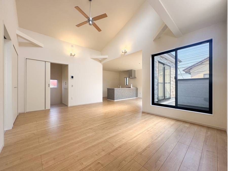 吹抜けがもたらす縦の開放感に加え、オープンキッチンやL字型バルコニーが視線に奥行きを与えます。