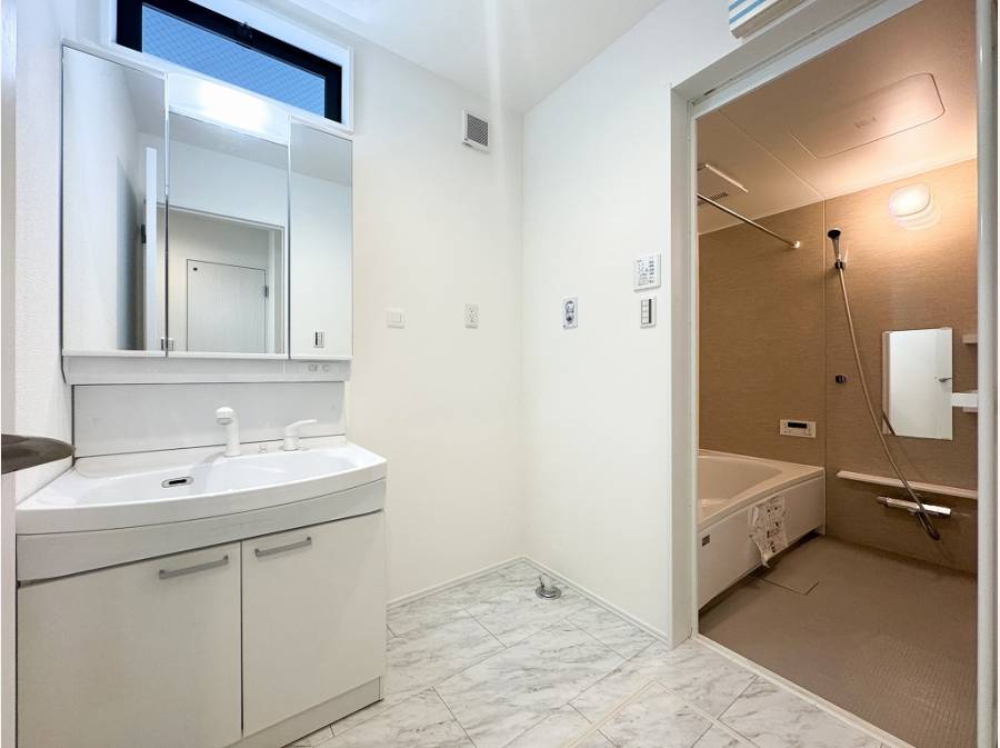 シンメトリーのフィルムが目を惹く全2棟の新築戸建のうち、白壁が爽やかな1号棟をご紹介します。