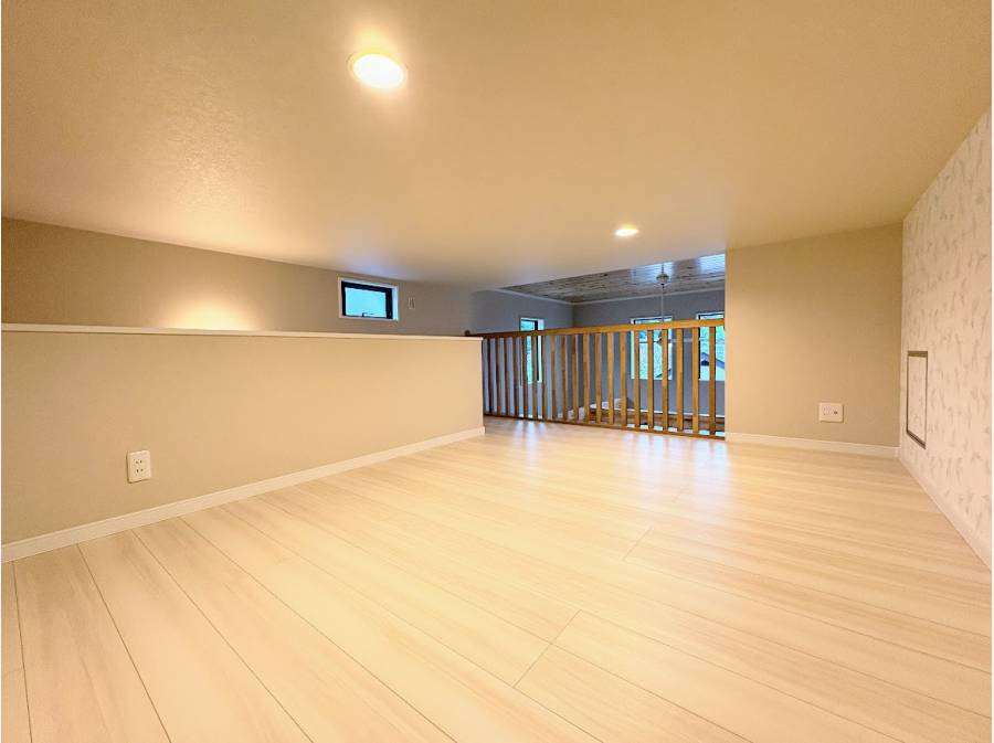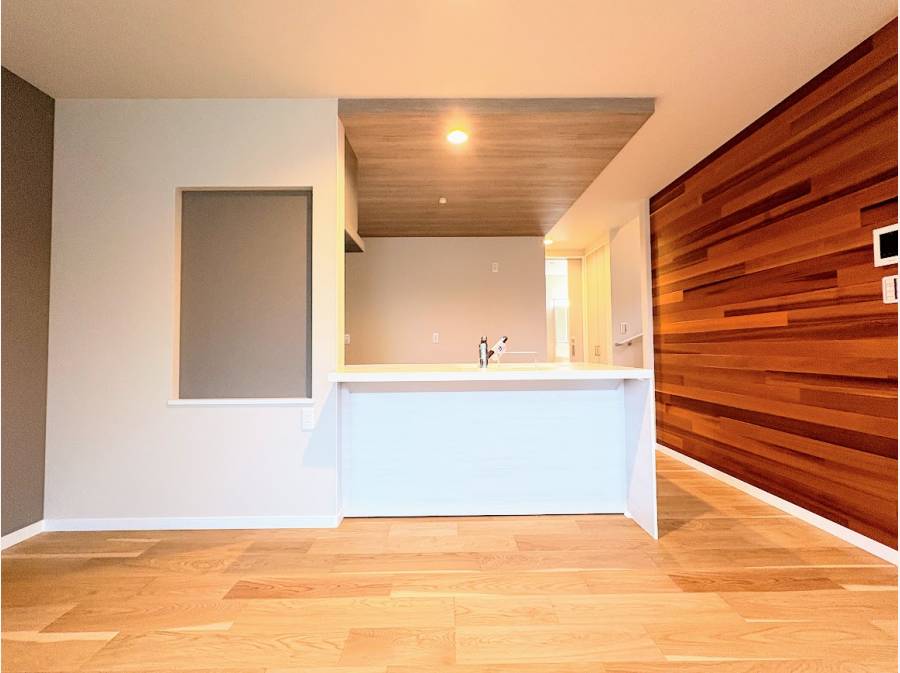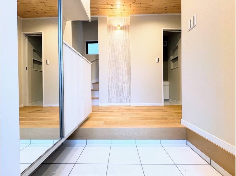 自然素材が活かされた室内は、暮らしに温もりと安らぎをもたらしてくれます。玄関やリビングダイニングキッチン(LDK)には無垢板が使われ、木の優しさを感じられる心地よい空間が広がっています。また、約19帖の広さを持つLDKには吹き抜けが施され、縦に伸びる開放的な空間が家族の団らんをさらに豊かにします。