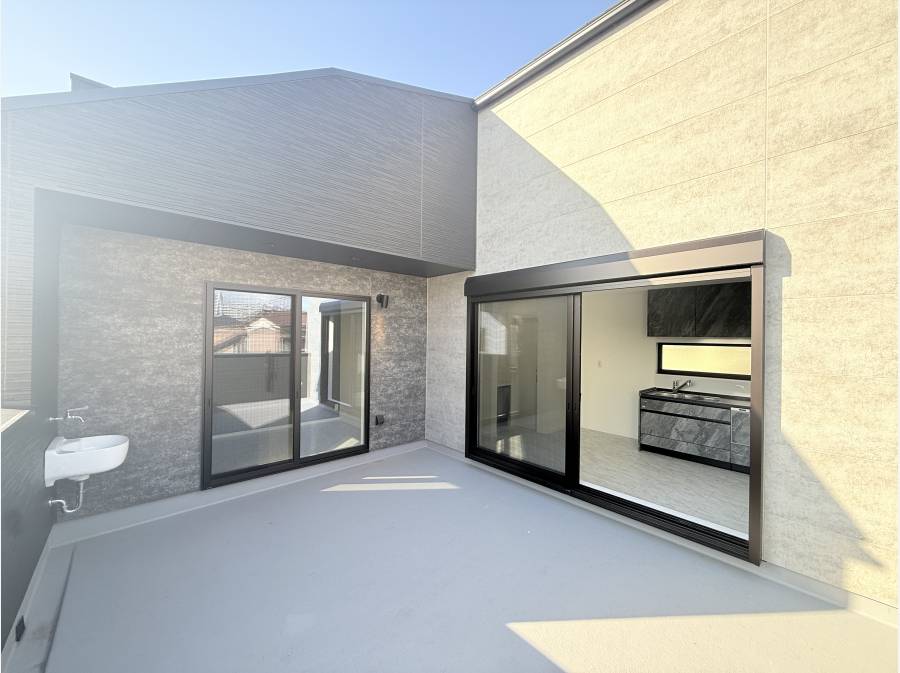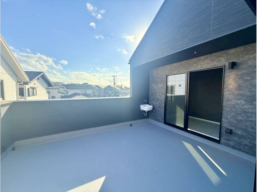 約10帖の広さを誇るバルコニーは、外の景色と一体になる贅沢なプライベートスペース。