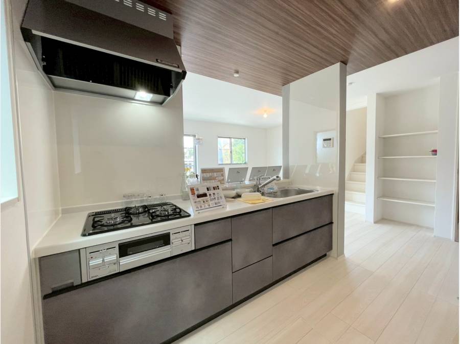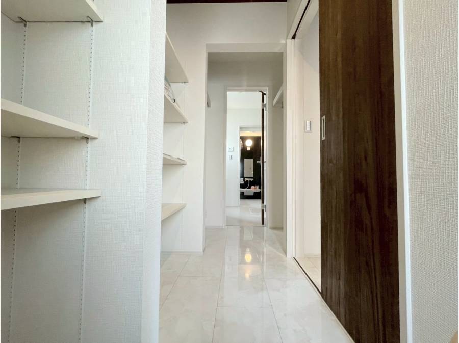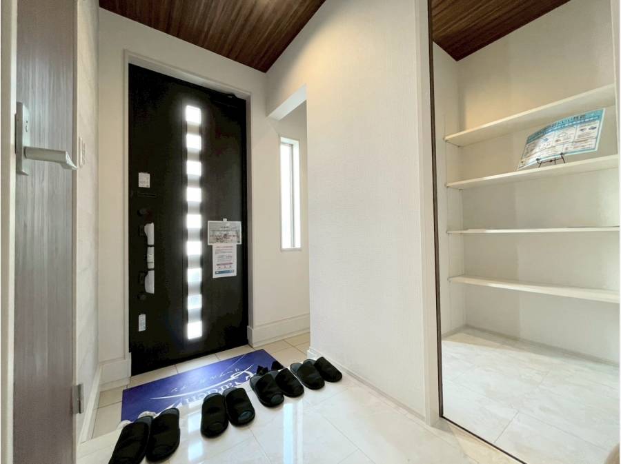 広い通りに面した開放感あふれる立地が魅力の新築戸建をご紹介します。エントランスには大容量のSICがあり、そのままストレージルームを抜けてパウダールームで手洗いができる便利な動線設計が特徴です。