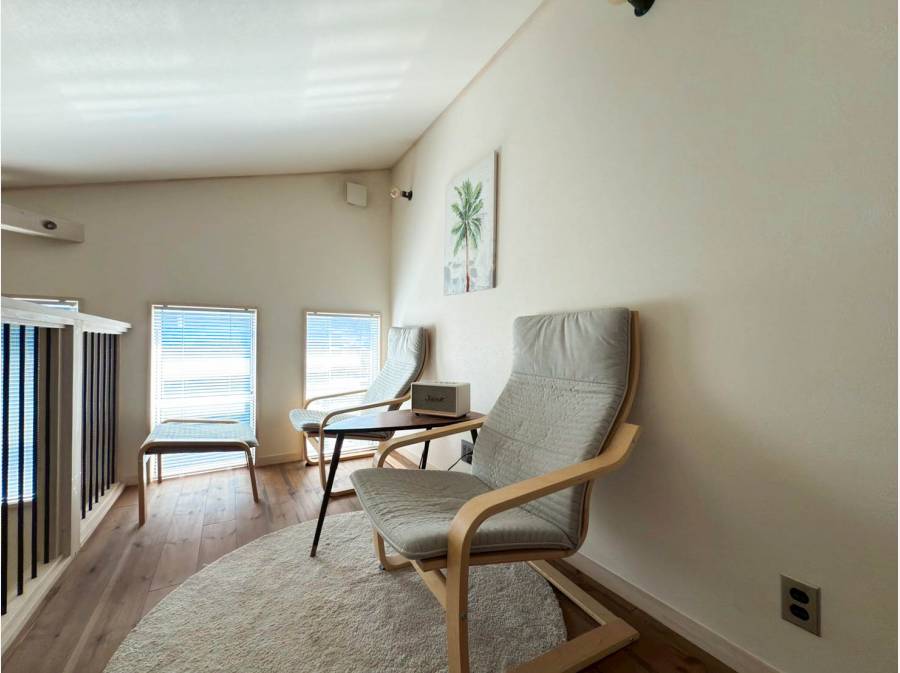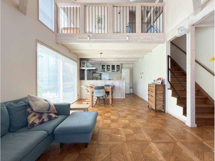 18帖の広々としたLDKは、上部がボイド仕様となっており、陽光がたっぷり差し込む明るさと開放感が魅力的。水回りが1階に集約されており、家事動線がスムーズな設計です。また、リビング横にはミニガーデンがあり、家庭菜園を楽しみながら外観のカリフォルニアらしい雰囲気をより引き立てます。