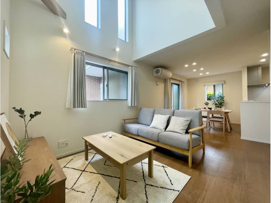藤沢市石川にある新築住宅のご紹介です。注文住宅仕様で、間取りは3LDKとなっています。17帖のLDKは吹き抜け天井となっており、上部に大きな窓があるため、明るく開放的な空間を楽しめます。