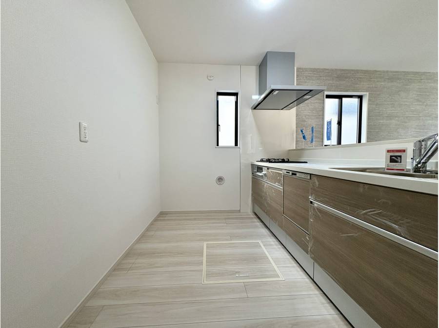 1階のLDKは約18.5帖の広さを持ち、天井のデザインが生み出す開放感が魅力です。さらに、床暖房が足元から家全体を心地よく温め、家族の時間を包み込むような空間を提供します。キッチンには食洗機などの設備が整っており、家事をよりスムーズに進められる工夫が随所に施されています。