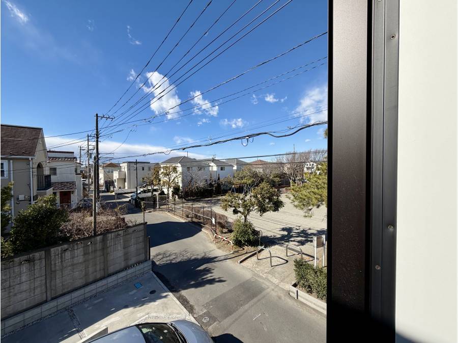 前面道路の向かいには公園があり、車通りも少なく静かな環境が整っています。小学校や病院も近く、子育てファミリーにとって安心できる住まいです。2階の窓からは公園が見え、室内からお子さまの様子を見守ることも可能です。