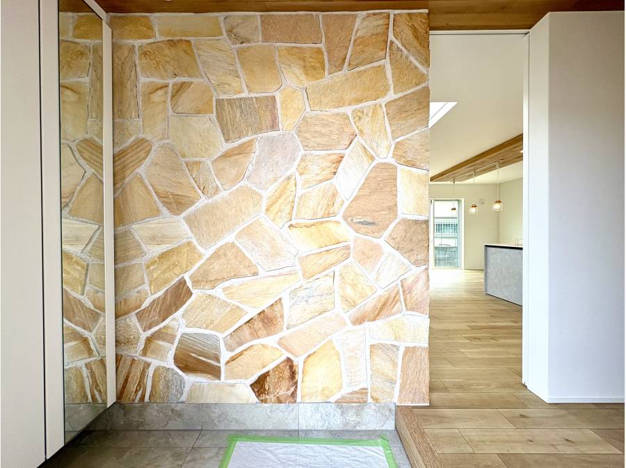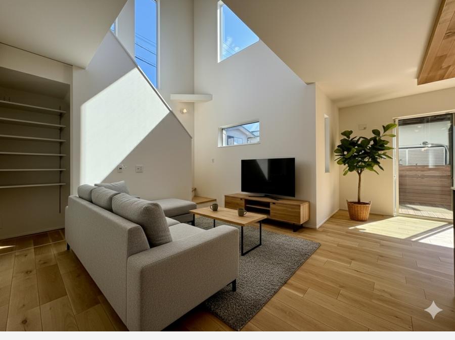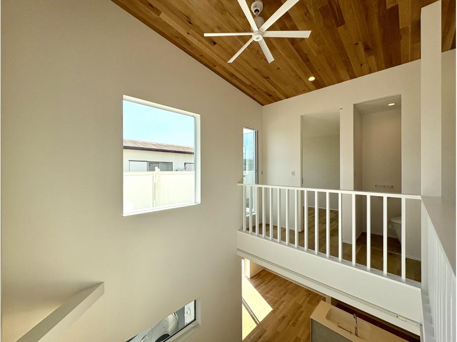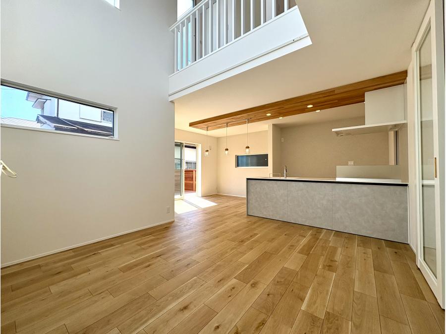 室内に足を踏み入れると、板張りの勾配天井が広がり、開放感あふれる空間がお出迎え。大きな吹抜けからたっぷりと差し込む日差しが、明るく心地よい室内を演出します。