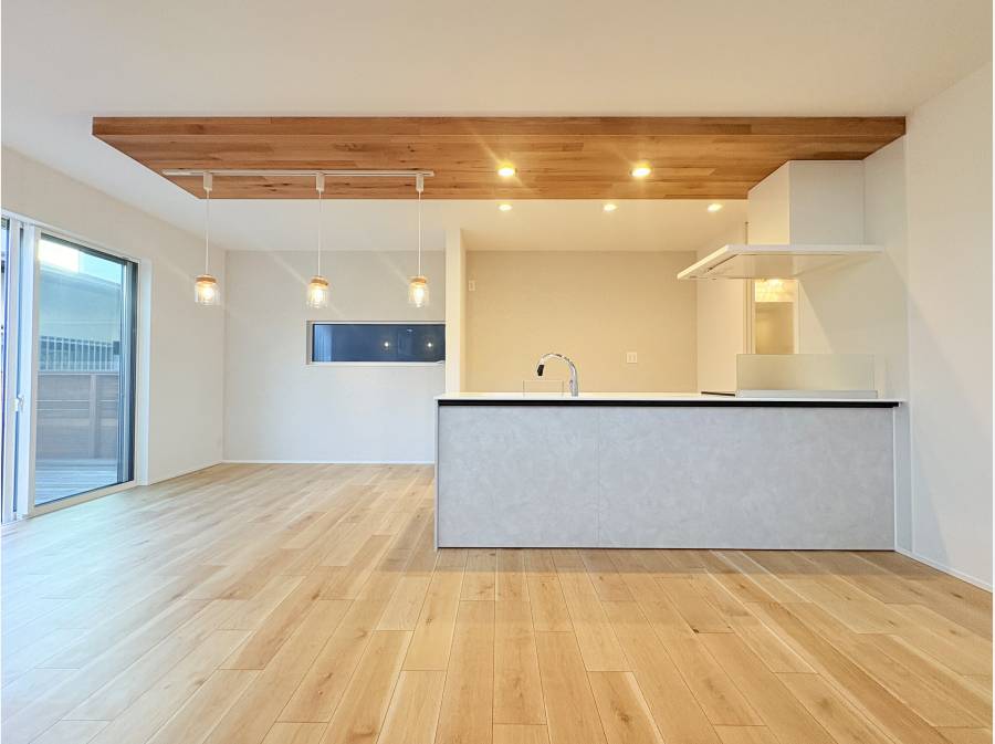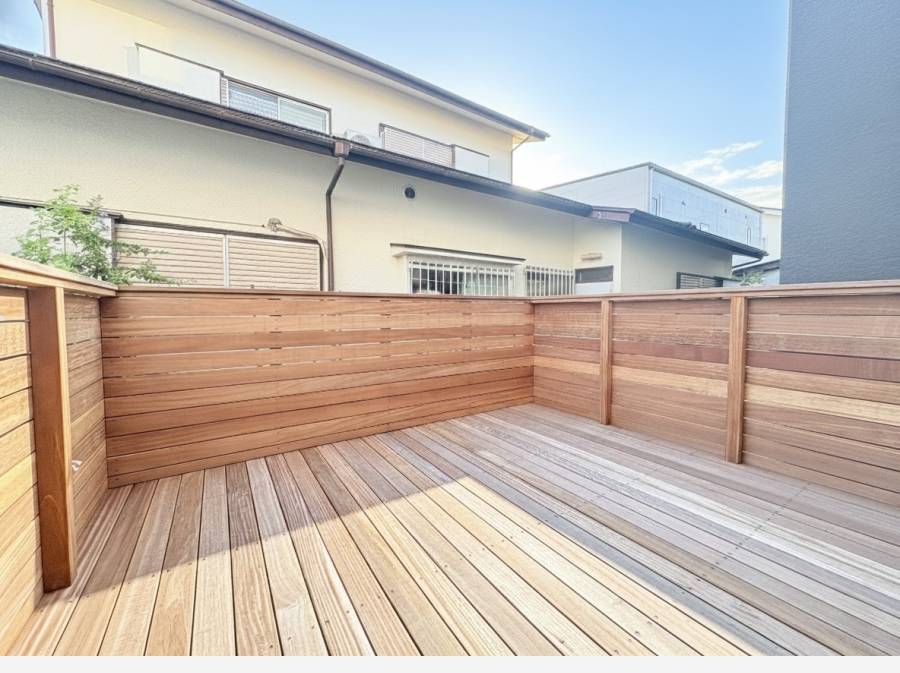 リビングから繋がるウッドデッキはバーベキューしたり、お子様のプールなど様々な用途でお使い頂けます。