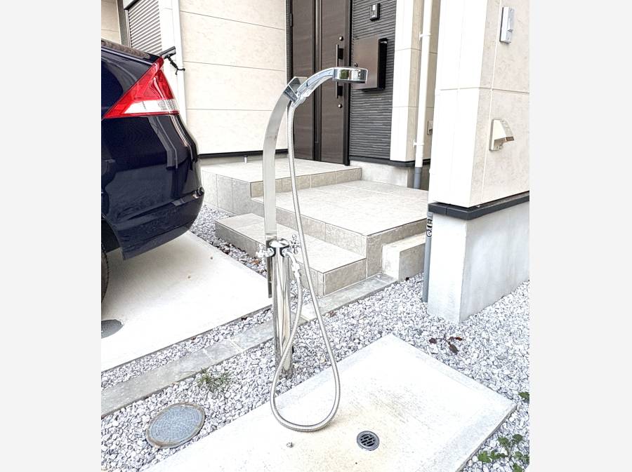 屋外シャワーも備わり、海帰りや外遊びの後に便利です