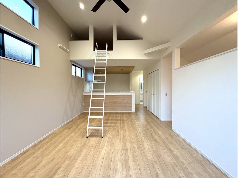 2階に上がると約18.9帖のLDKが広がり、視線が自然と上に抜ける勾配天井が特徴です