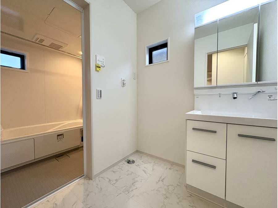 洗面室からバルコニーへ直接つながる動線は、洗濯の負担を軽減してくれる頼もしい要素です