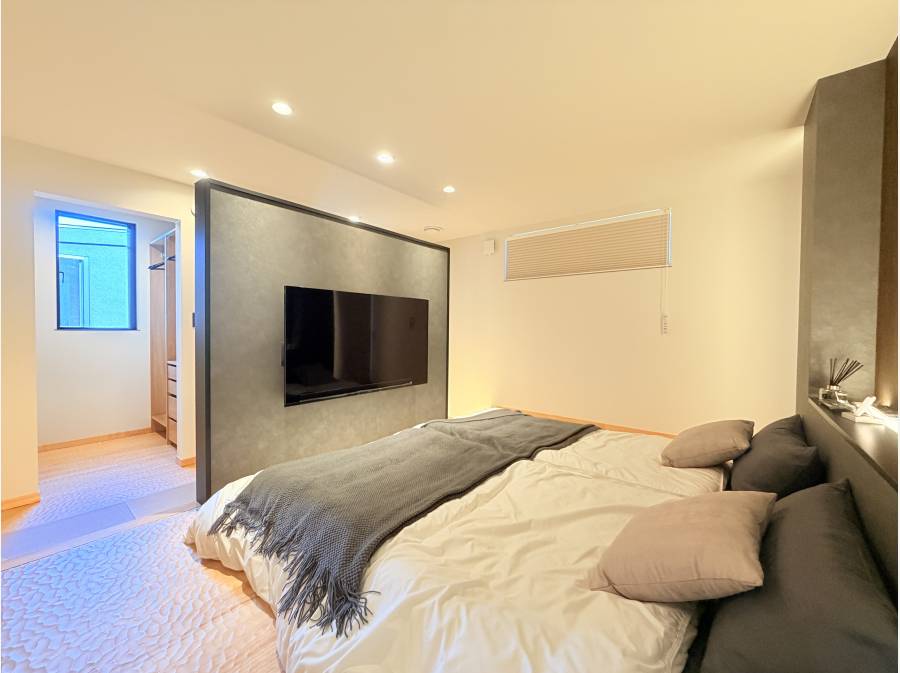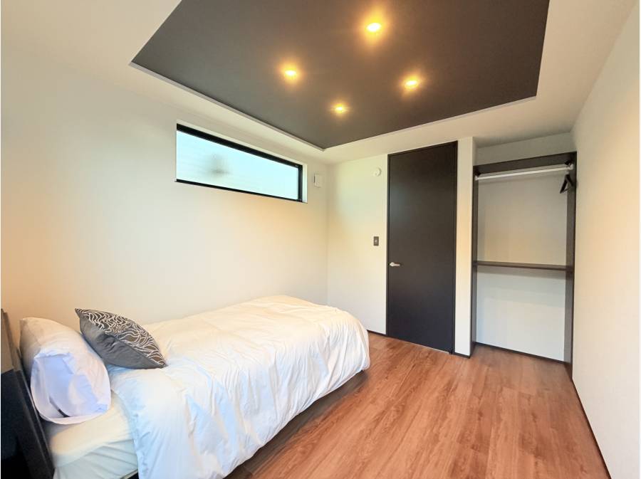 階段の手すり、お部屋、寝室と間接照明が美しいです。