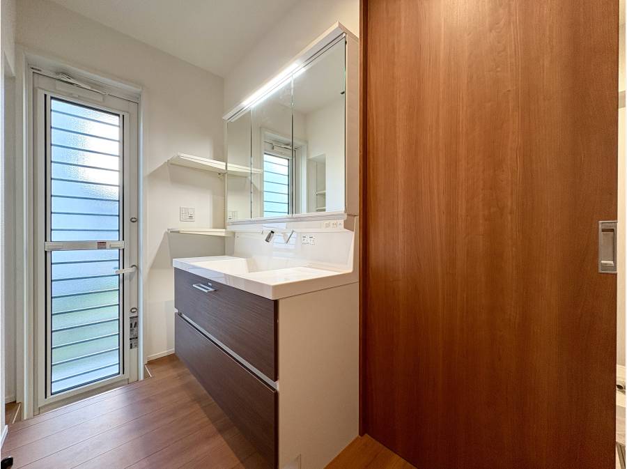 外部温水シャワーから洗面室に直行できる設計で、