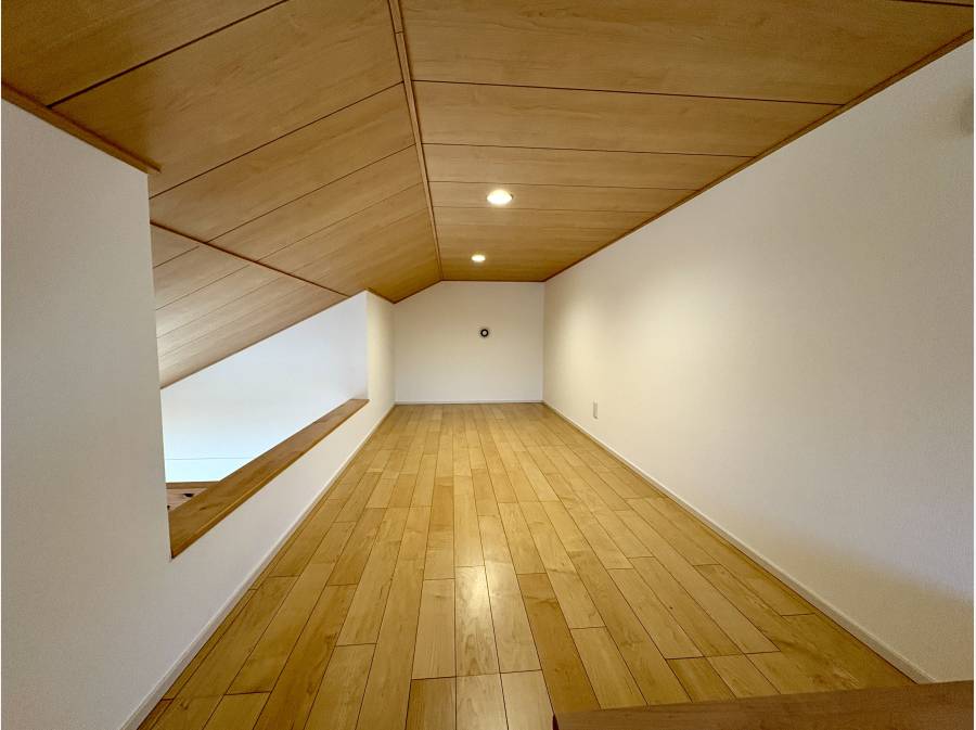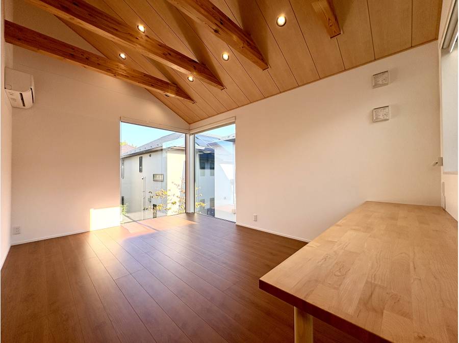 2LDK+ロフトの間取りは、吹抜けと勾配天井による開放感が魅力。