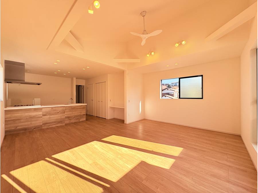 勾配天井が特徴の約20.3帖のLDKには、リビングとダイニング部分に床暖房を設置。家族みんなでゆったり過ごせる4LDKの間取りが自慢です。